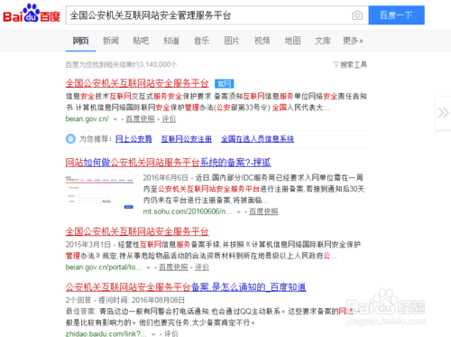 首先輸入網(wǎng)址http://www.beian.gov.cn 或者百度搜索“全國公安機(jī)關(guān)互聯(lián)網(wǎng)站安全管理服務(wù)平臺(tái)”就會(huì)看到第一個(gè)就是。
