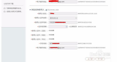 進(jìn)入網(wǎng)站負(fù)責(zé)人信息和網(wǎng)站緊急聯(lián)系人,按時(shí)填寫。繼續(xù)“下一步”;